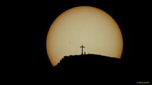Gruß an die herbstliche Sonne - Das obige Bild könnt ihr hier in Originalgröße betrachten, oder oben auf der Webseite Eine unbekannte Wandererin oder Wanderer winkt in 5 km Abstand am 17. September 2023 um 8h22 MESZ vom neuen Gipfelkreuz des 1753 Meter hohen Gamsknogel. Währenddessen steigt in 30-Millionen-facher Distanz unsere Sonne empor. Da sie aktuell recht aktiv ist, sind auf […]